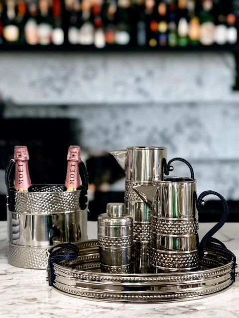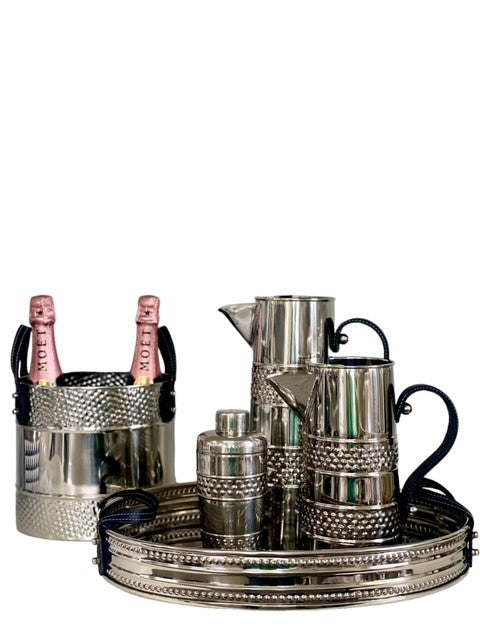 • This Stainless Steel Oval DOUBLE BAND BORDER Tray with Leather Handles 47cm is a versatile tray that features black leather handles. It is designed in a Manhattan style and is ideal for use in high-end homes and bars. The dimensions are 47cm x 35cm x 7cm. Check out our full range.