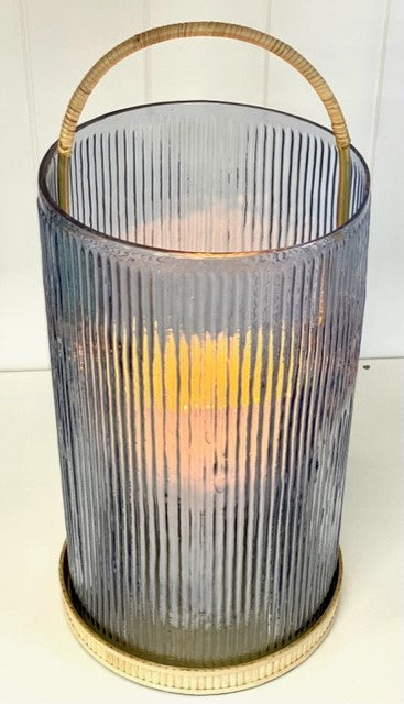 • Enhance your home decor with the latest in trendsetting candle lighting design. With its stunning rattan woven base and handle and the intricately ribbed glass flue, with blue hues of the Med, this hurricane lantern is sure to impress. Crafted with top-quality materials, its 27cm x 20cm dimensions and 49cm handle height make it both grand and functional. Enjoy the ambient mood lighting this exquisite piece brings to any room.