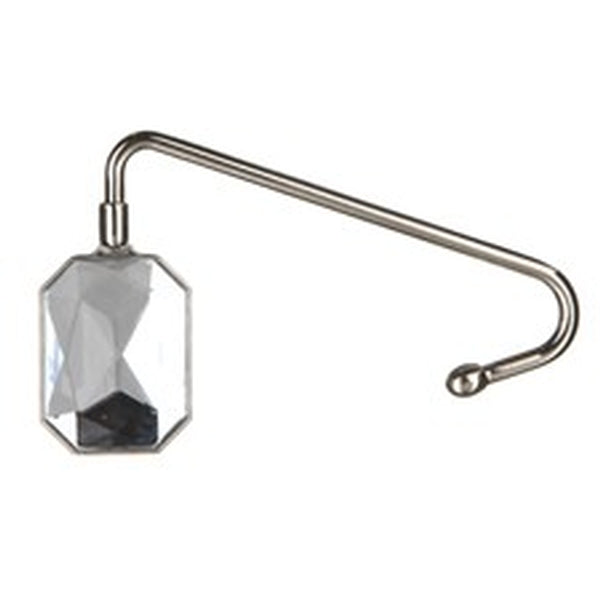 • (56C) Handbag Hook w/ Rectangle Shaped Clear Crystal What woman hasnt struggled with the problem of where to park her purse at restaurants, meetings and other occasions? Sling it over the back of the chair? Too vulnerable. Keep it in your lap? Too awkward. Place it on the floor? The flat, silver-tone purse sits on the tabletop and a metal hanger drops under the table, where you conveniently and confidently place the strap of your purse.