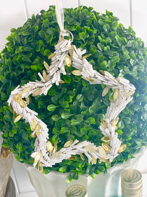 • Transform any space into a stunning showcase with our White Beaded Star. This elegant and exclusive piece features a delicate white beaded star adorned with luxurious gold crystals, adding a touch of opulence and sophistication to any room. Elevate your decor with this beautiful statement piece.