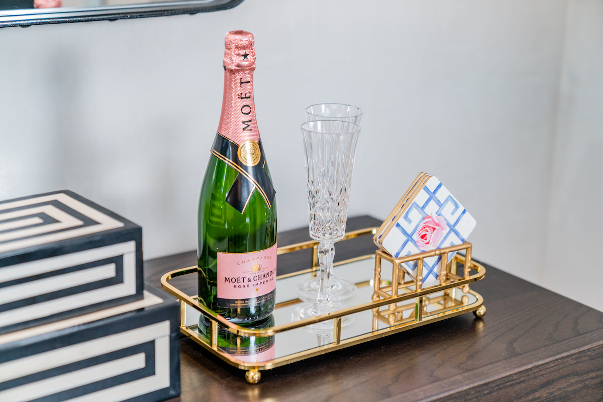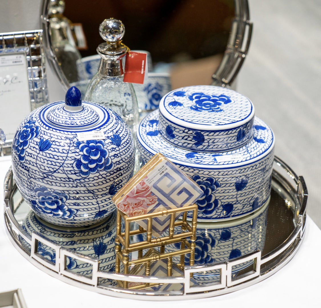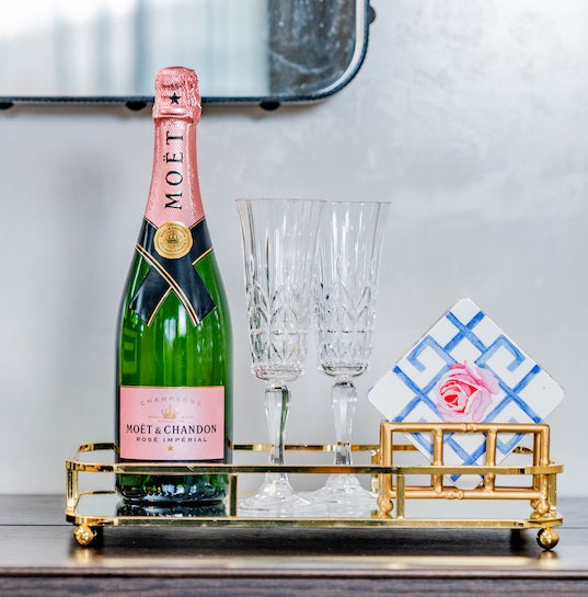 96G - Gold Bamboo Stand W/4 Coasters Blue & Pk