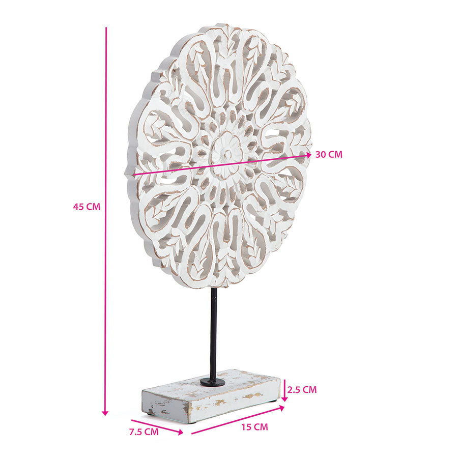 • Add a touch of bohemian into your relaxed space with the Handcrafted Mandala Round Plaque. Handcrafted by skilled artisans in India, this piece is made from sustainable mango wood and MDF in a distressed white finish with a black iron stand. With a carefully hand carved mandala design, it's a one-of-a-kind beautiful piece that makes for a beautiful statement on your console or side table. Finish the look by adding beaded tassels, dried flowers and a candle.