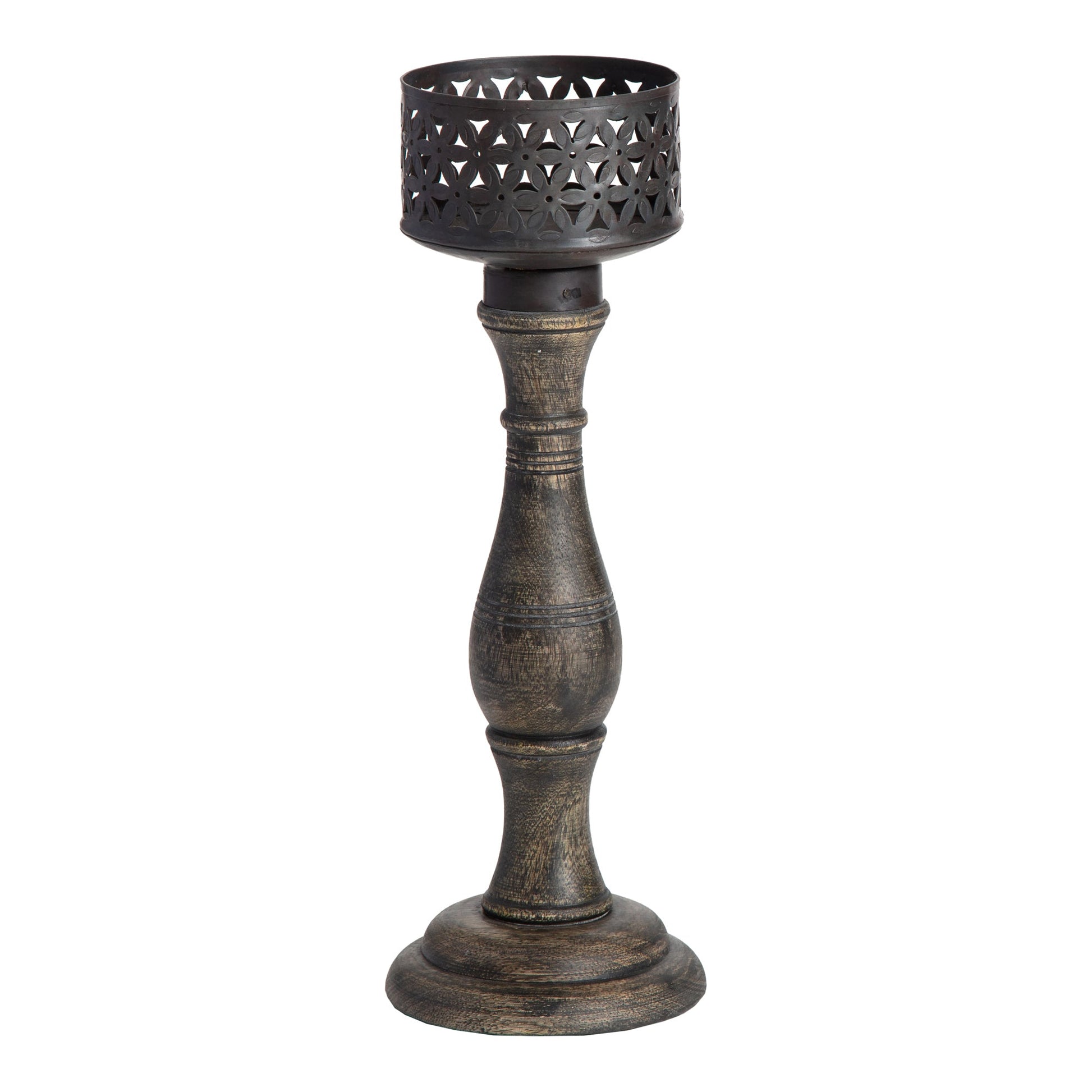 • Create a warm and cosy home with the Large Handcrafted Chateau Pillar Candleholder. Handcrafted by skilled artisans in India, this piece is made from sustainable mango wood and iron in a distressed charcoal finish. A classic pillar candleholder shape with a lovely metal flower pattern for the flame to flicker through. Simply add a pillar candle and style on a console table, dining table or side table and enjoy the soft ambience.