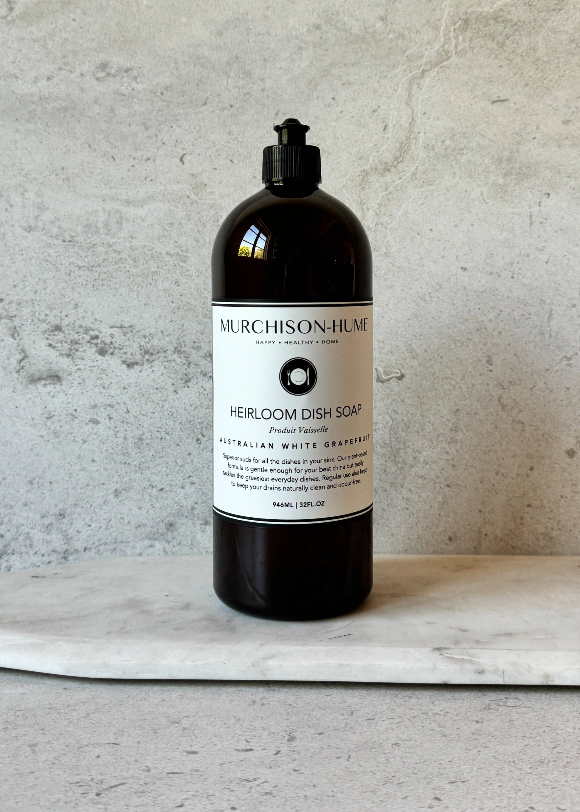 • The original status Dish Soap. Use this to refill your glass Heirloom Dish Soap or straight from the bottle. Superior suds for all the dishes in your sink. Our exclusive, easy-to-rinse formula is gentle enough for your best china but still tackles the greasiest everyday dishes with ease. Your dishes deserve nothing less. Uses: For small washing jobs, apply directly to your dish brush. For a full sink, pump or squirt liberally onto your brush and hold under a warm, running tap. Our Advice: Regular use will help keep your drains naturally clean and odour-free. Safe for septic tanks. 32 oz. (1 litre) Fragrances * Australian White Grapefruit: Our signature scent.