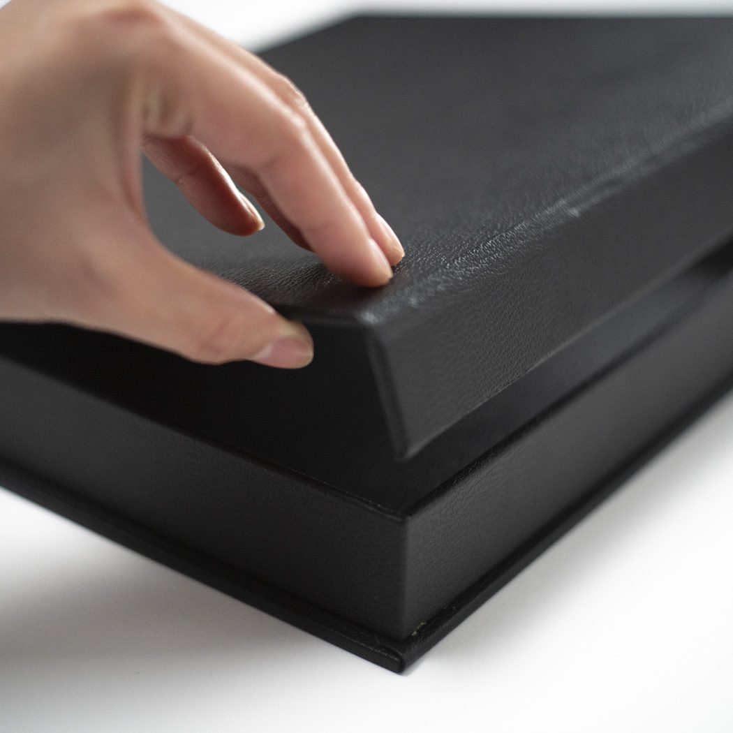 • Our handcrafted Lipped Clamshell range are signature Zetta Florence products. Renowned for their quality and elegance, our boxes allow for a 30 sleeve capacity. The box is a black hardwearing texture with a stylish Buckram finish. Ideally used for protecting and displaying your documents and art, whether it’s for your portfolio, your family history, or for the workplace. Best suited in conjunction with our archival Mylar sleeves.