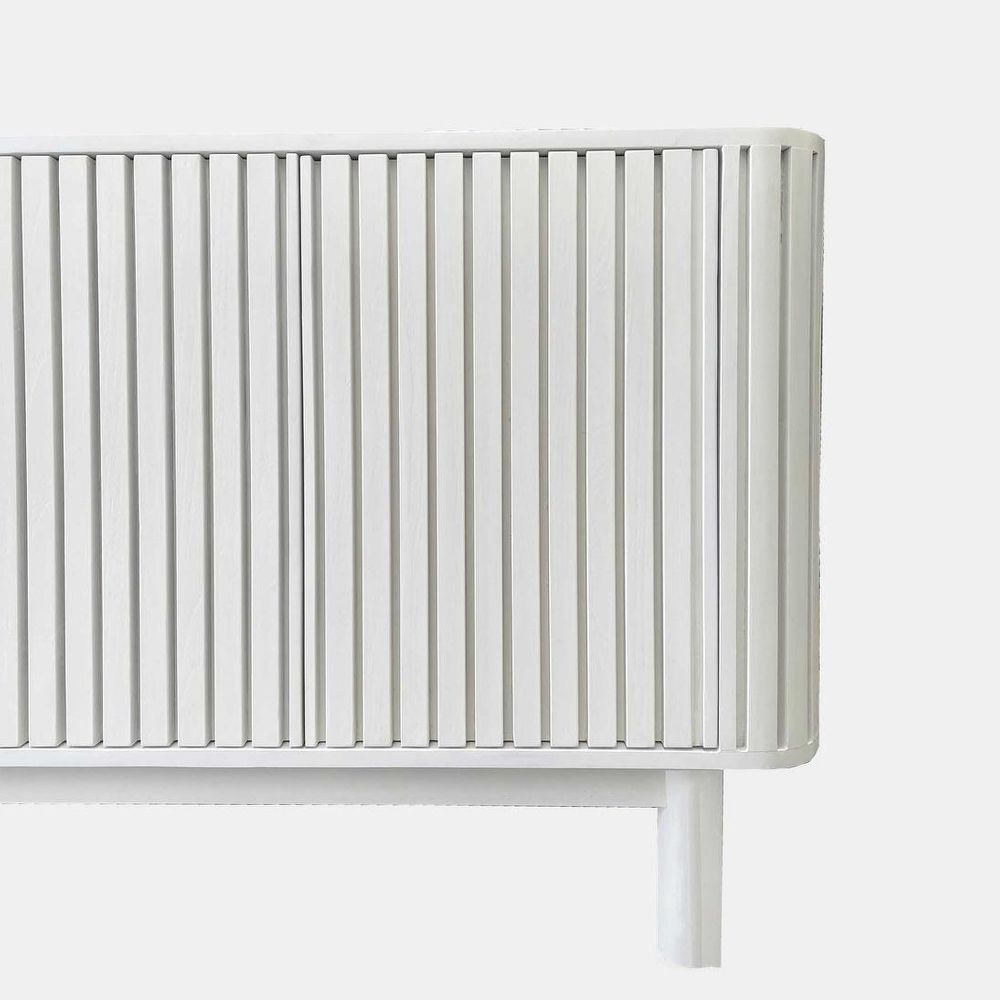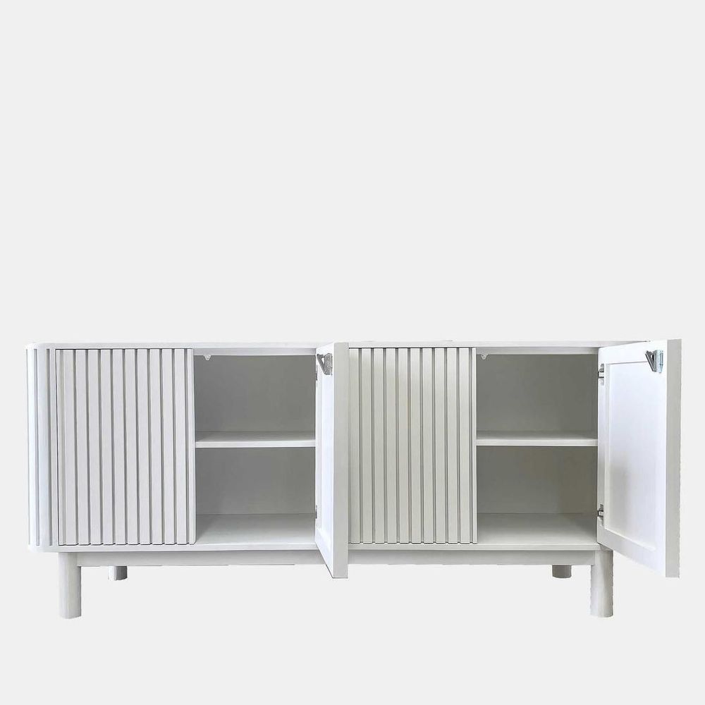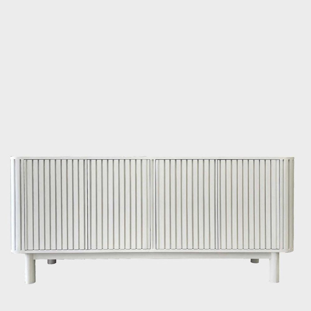 • Treat your dining area to a touch of elegance and ample storage with our Vince Buffet in Chalk. Crafted from solid timber wood, it features a streamlined front crafted from slatted strips that cleverly hide the unit's doors. With push-to-open doors and gracefully curved sides, it offers both aesthetic appeal and practical storage space, making it suitable for use as a serving station in the dining room or for organizing dinnerware in any space.