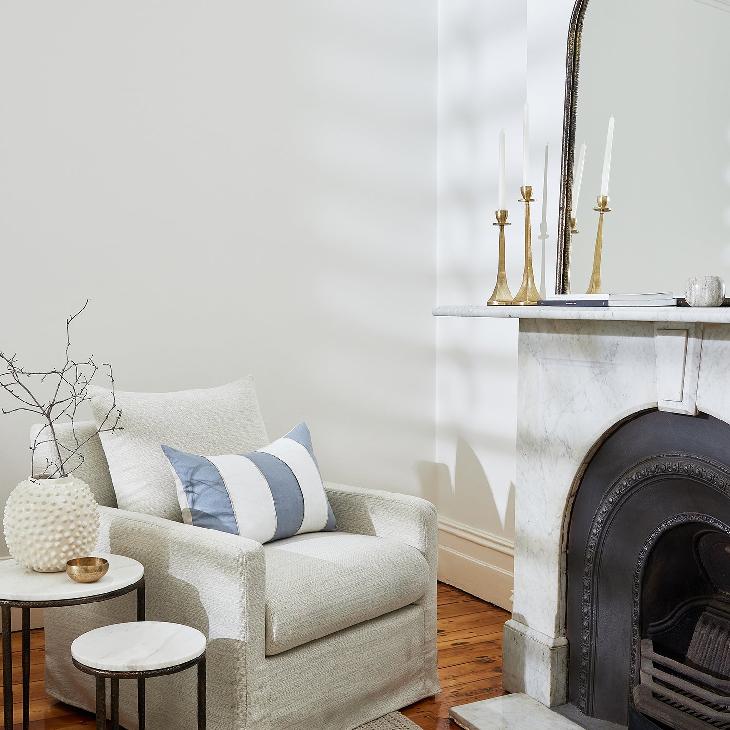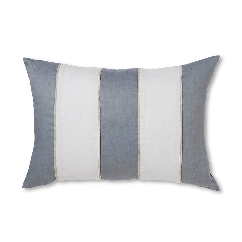 • Patched stripe design in a light blue, white and natural. Reverse is light blue. Concealed zip at base of cushion.