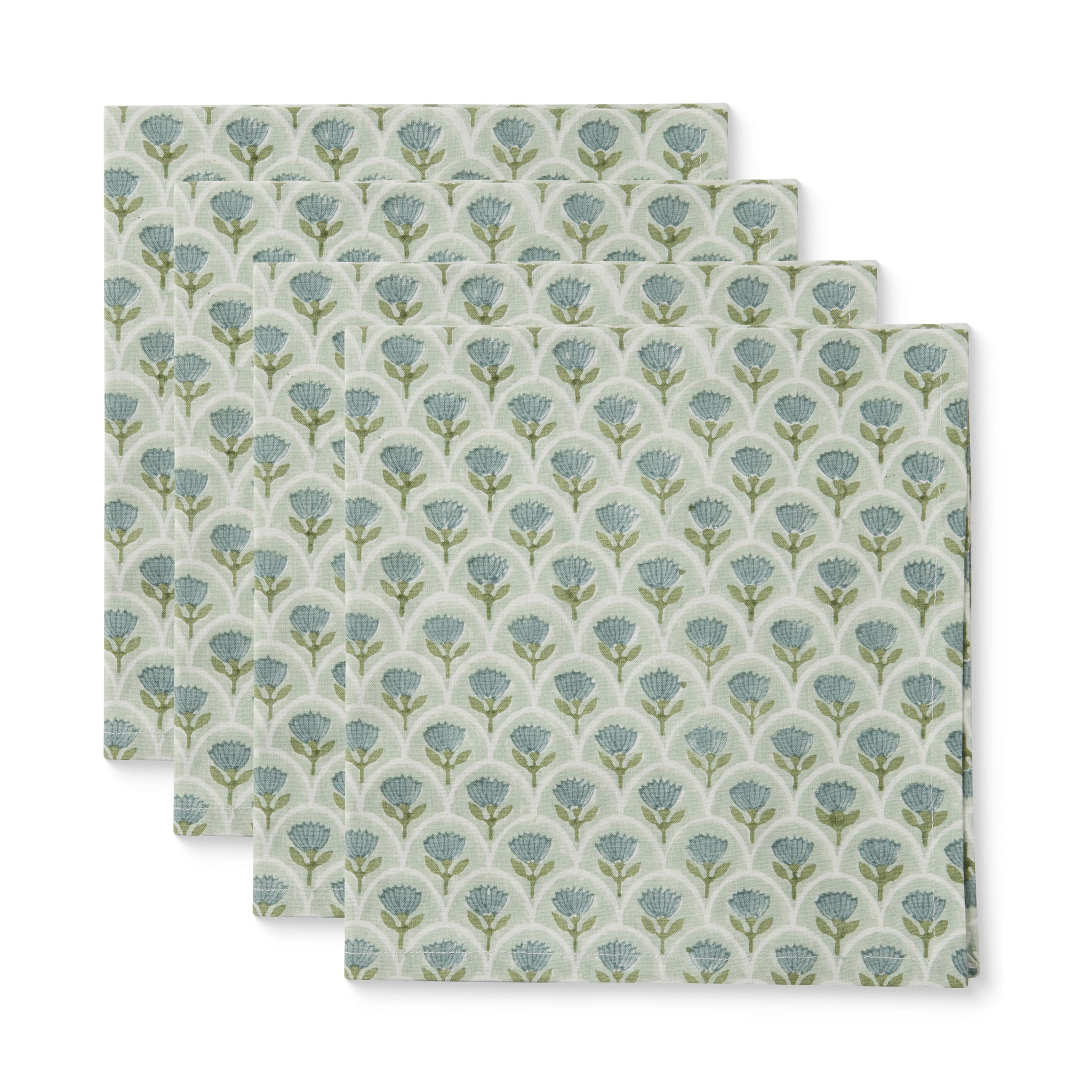 • Seafoam block print scallop floral print napkin set of 4. Due to the handmade nature of this product, some variation piece to piece may occur.