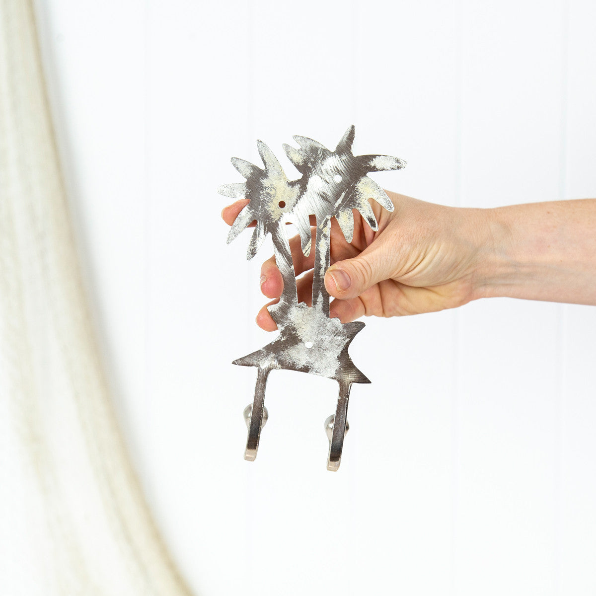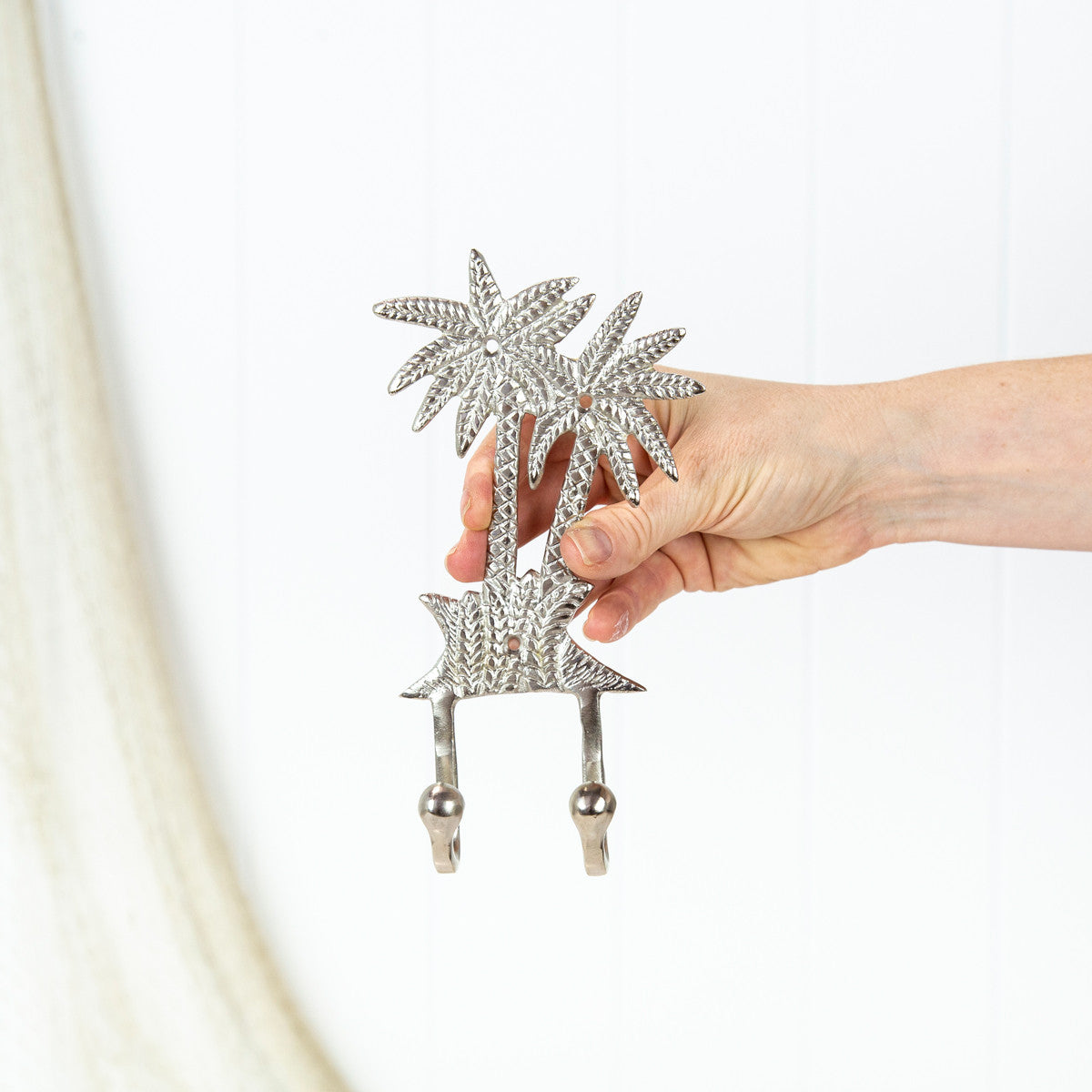 • 这个挂钩由黄铜制成,表面镀铬。它有两棵棕榈树和两个挂钩。
