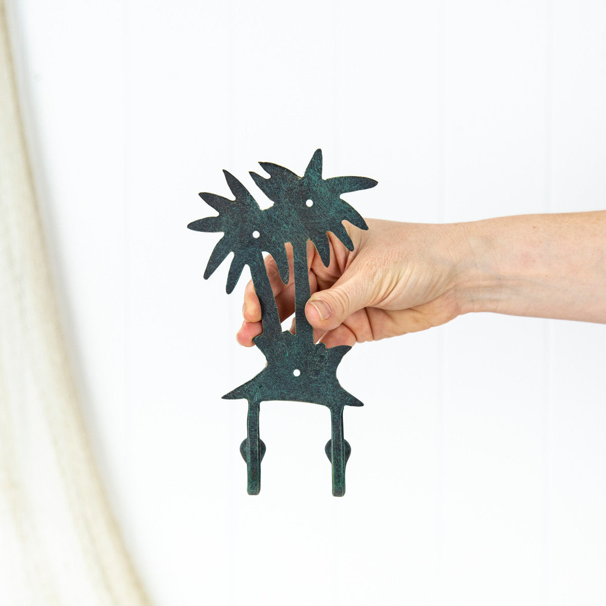 • This hook is made from  brass that has been aged and given a hint of green patina. It has two palm trees, and two hooks.