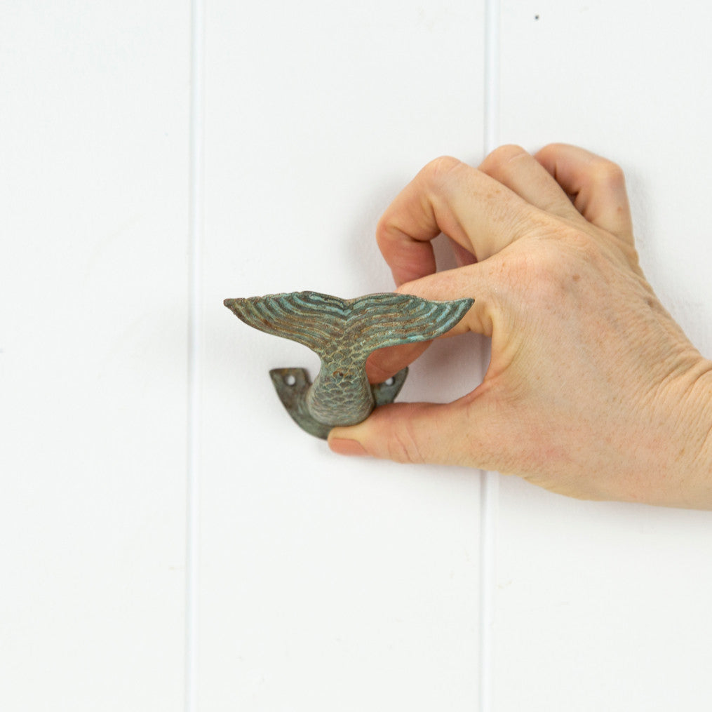 • This mermaid tail hook is made new from brass and is aged to a green patina finish.