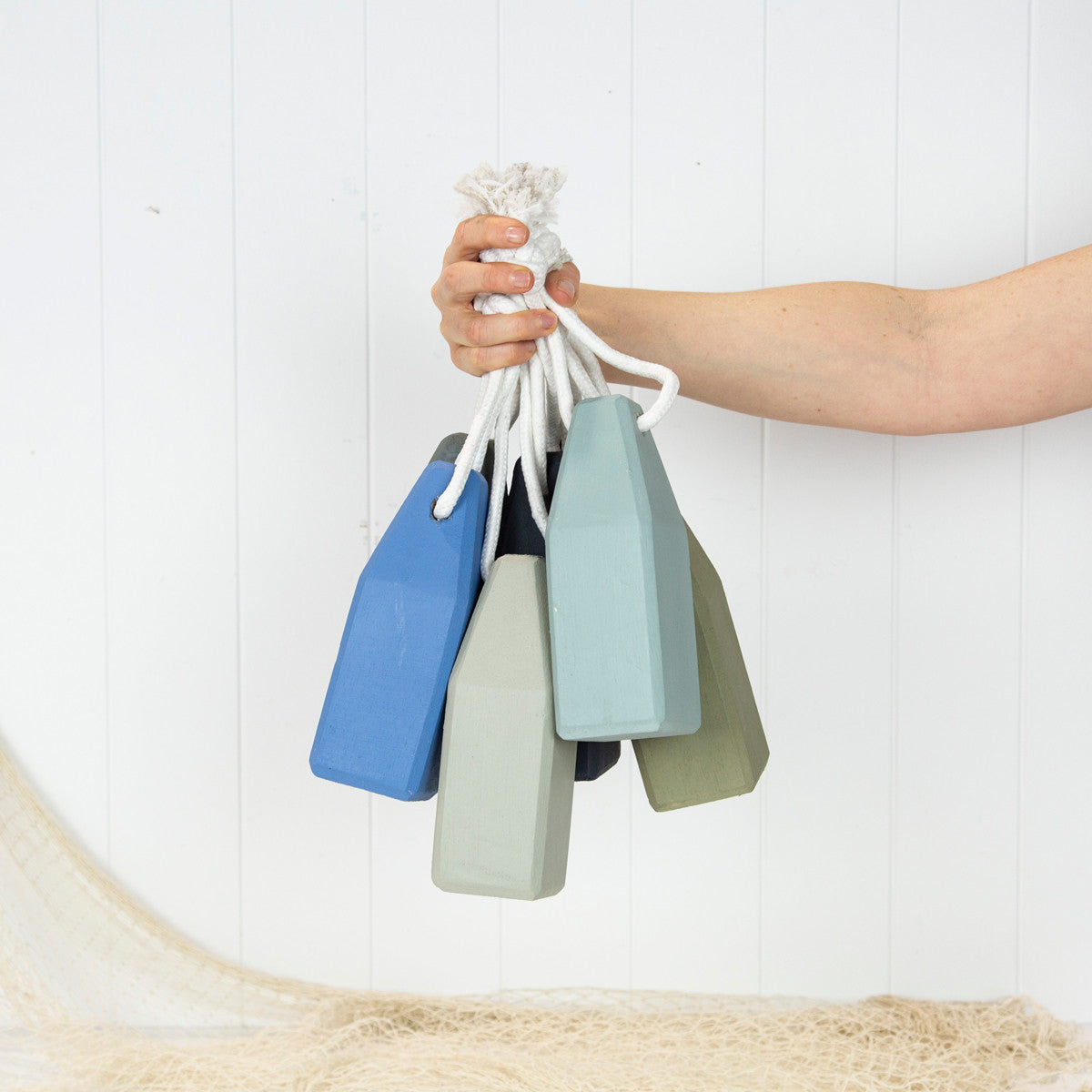 • We have had these wooden buoys custom made to resemble lobster pot buoys, and we have painted using our Jolie Paints range to co ordinate with our CoV range of paddles, oars and life rings!