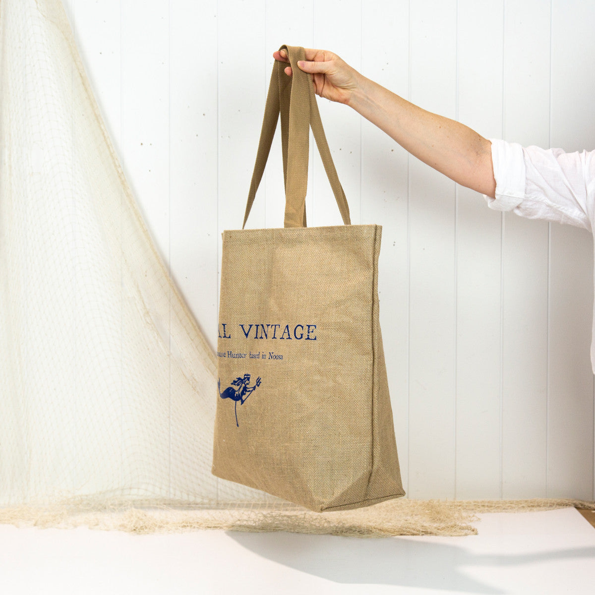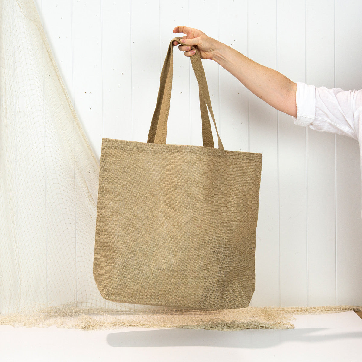 Made from burlap that has a bonded plastic lining, it is perfect for the beach to bringing home wet togs, or flotsam and jetsam and beach combing treasures!