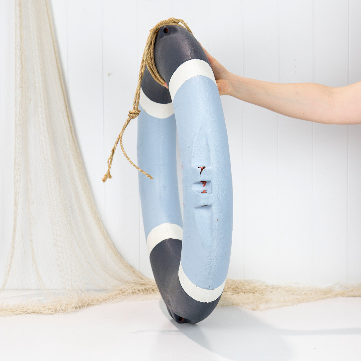 Your life ring will be custom painted in the colours shown here, however as each is a truly authentic item, it will display different markings and rope, reflecting its life at sea.