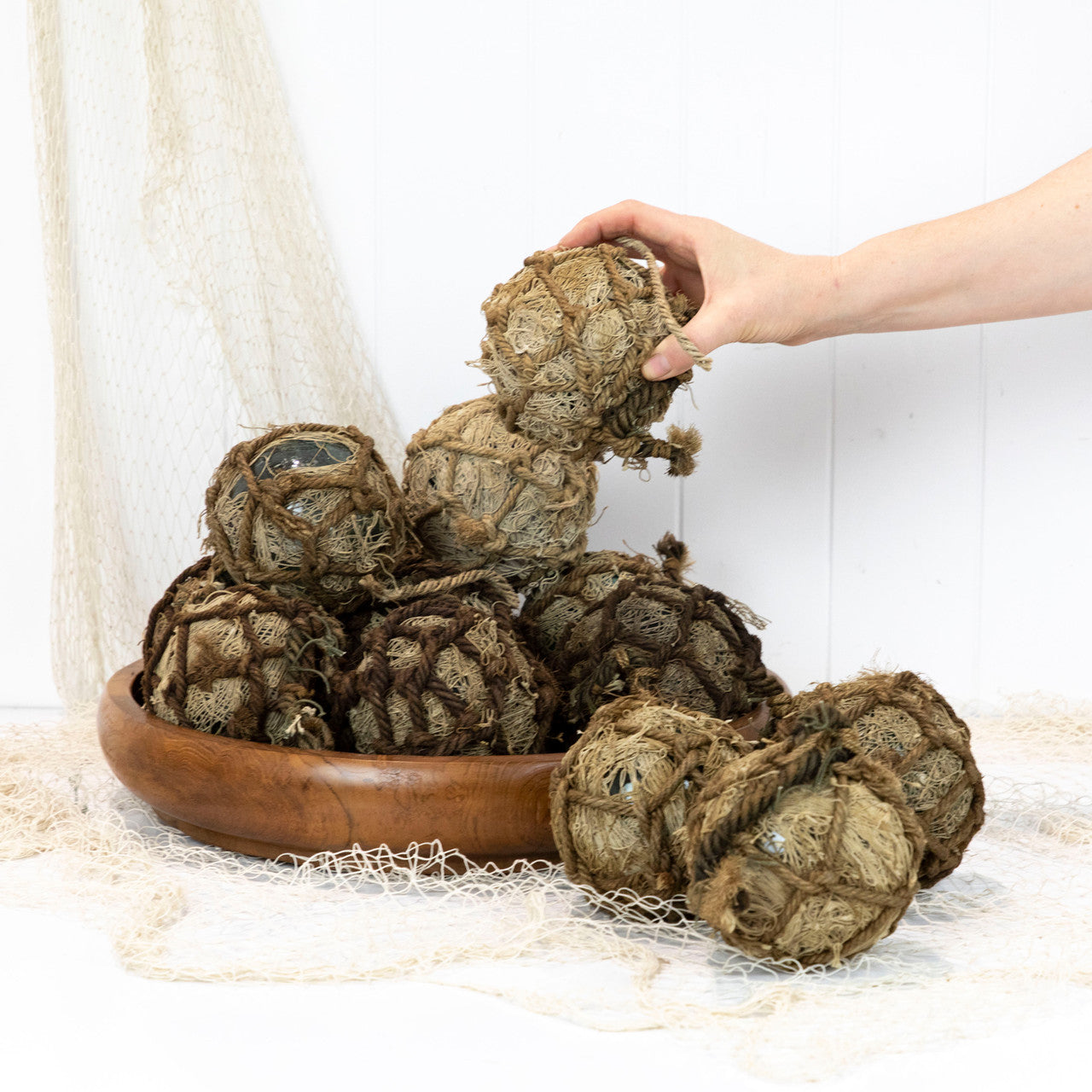 Each old 4"glass float has been wrapped in cotton fishing net, before a jute rope has been knotted over the top to hold it in place.