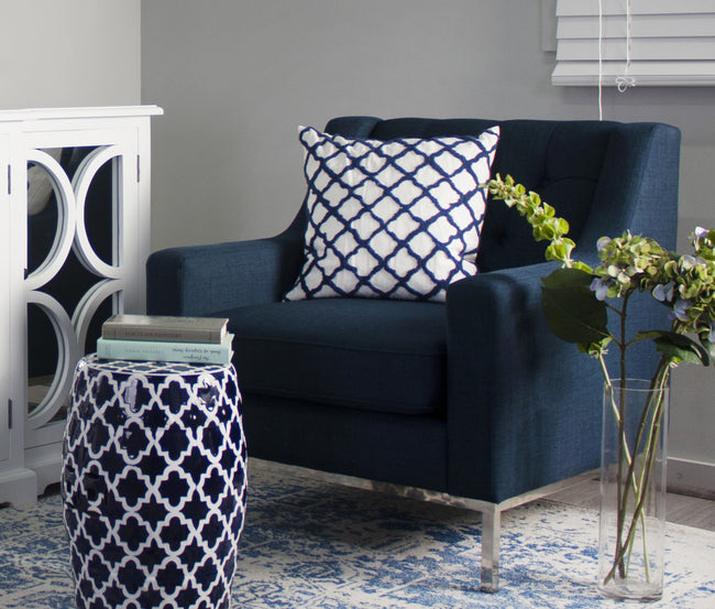 这款刺绣靠垫采用四叶草图案。材质为60%羽毛、10%聚酯纤维和30%棉,颜色为白色和蓝色。