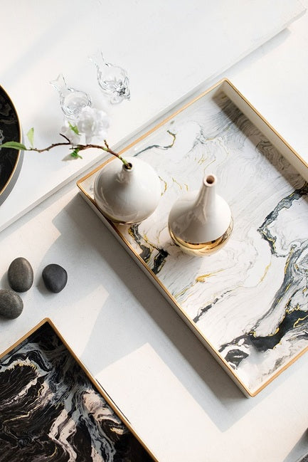 • 这套 2 个塑料托盘可让您获得天然石材的奢华外观。一个是黑色大理石图案,另一个是白色大理石图案。它们彼此相配,因为它们有两种不同的尺寸。由塑料制成。尺寸为 48 x 35 x4 厘米(长)45.5 X 30 X 4 厘米(小)