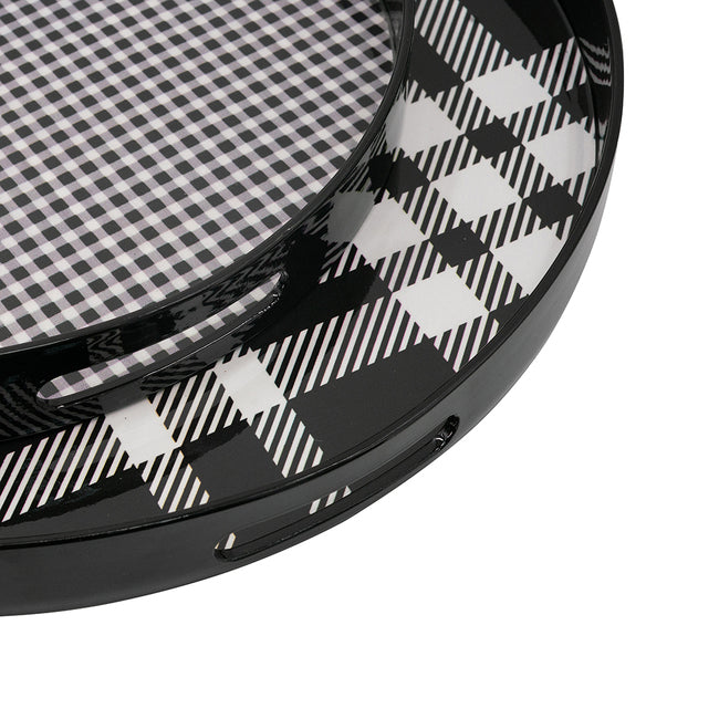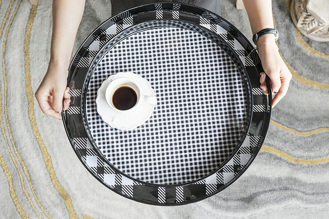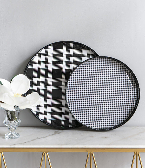• 这款时尚的圆形装饰托盘采用黑灰色格子图案,非常适合为任何现代家居增添柔和感。这款托盘套装是复古的最爱,优雅而优雅,由塑料制成,边缘较高,让人联想到经典的复古广告托盘。它是家庭中各种空间的绝佳桌面话题。尺寸为大号 45.72 厘米 x 3.81 厘米,小号 38.1 厘米 x 3.81 厘米,重量 2.09 公斤,100% 塑料制成