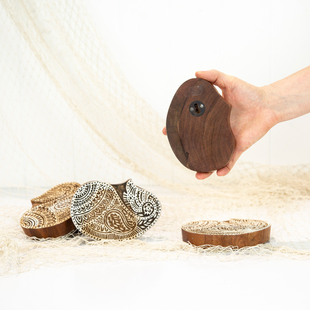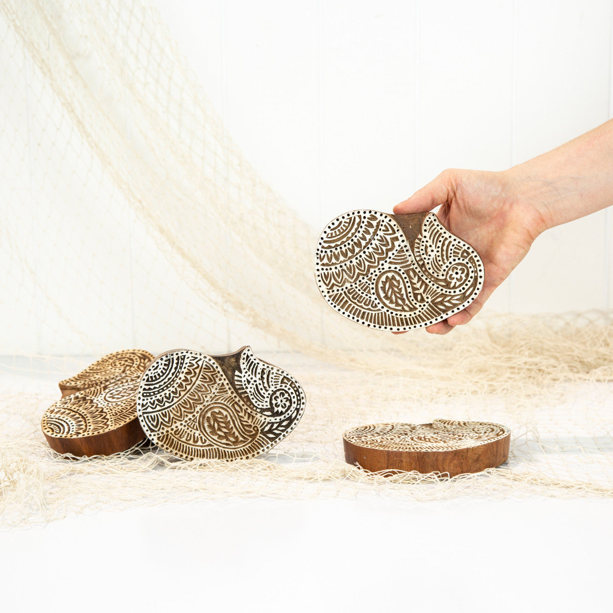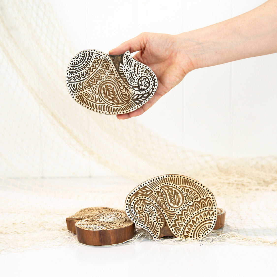 • The sweet Indian printing blocks have been carved from timber, with the design highlighted in white.