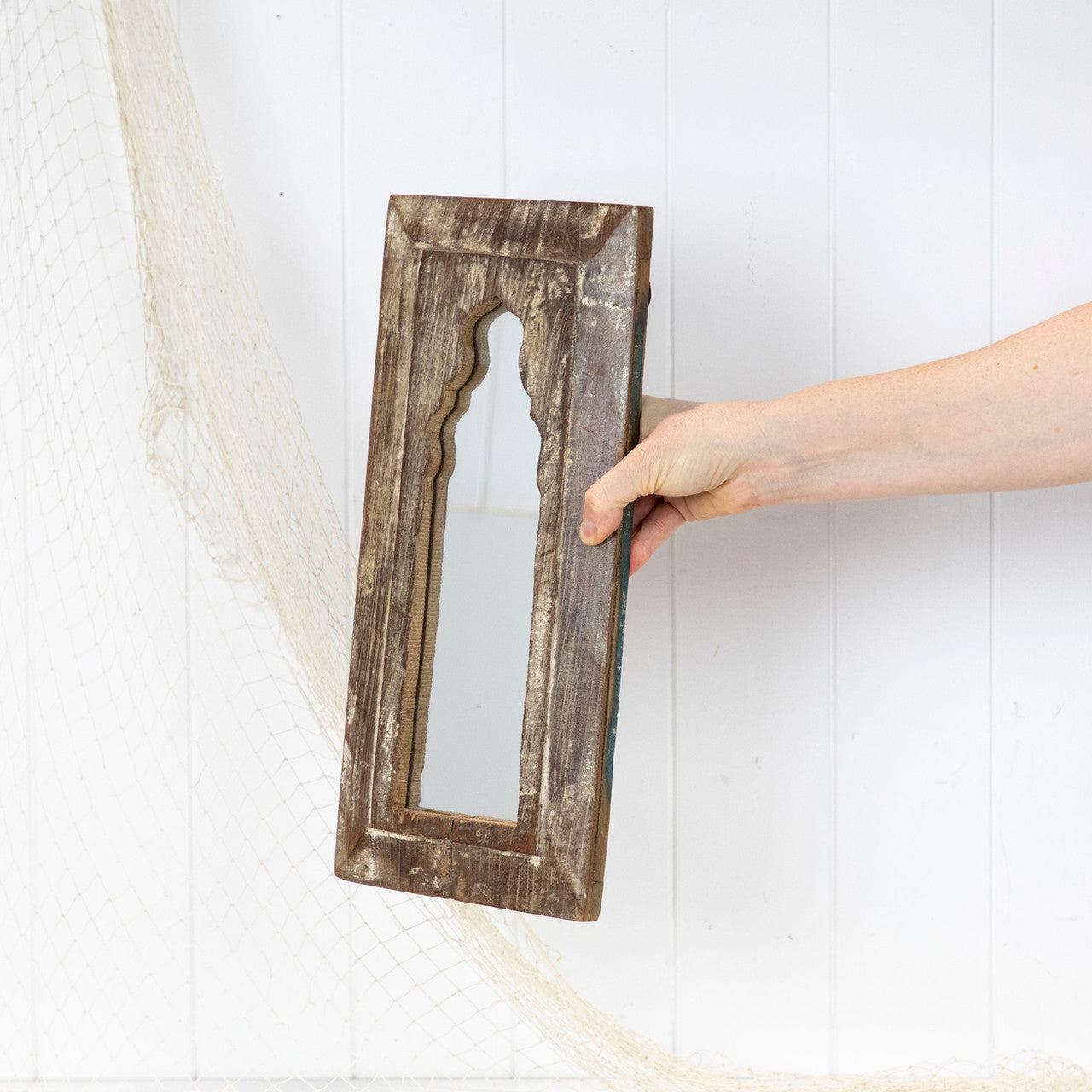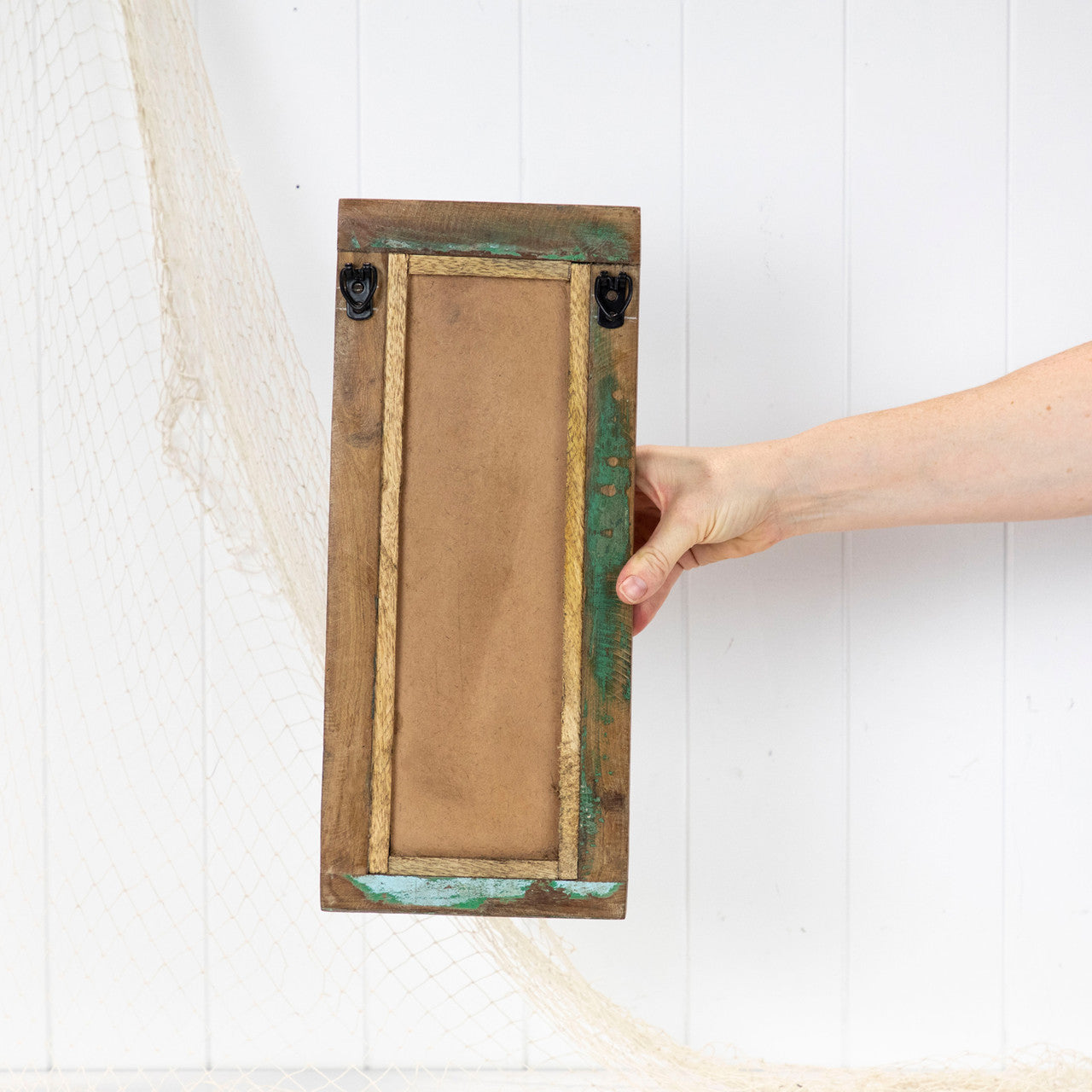 The timber is beautifully aged, with some remnants of past paint colours. Fitted with hooks ready to hang.