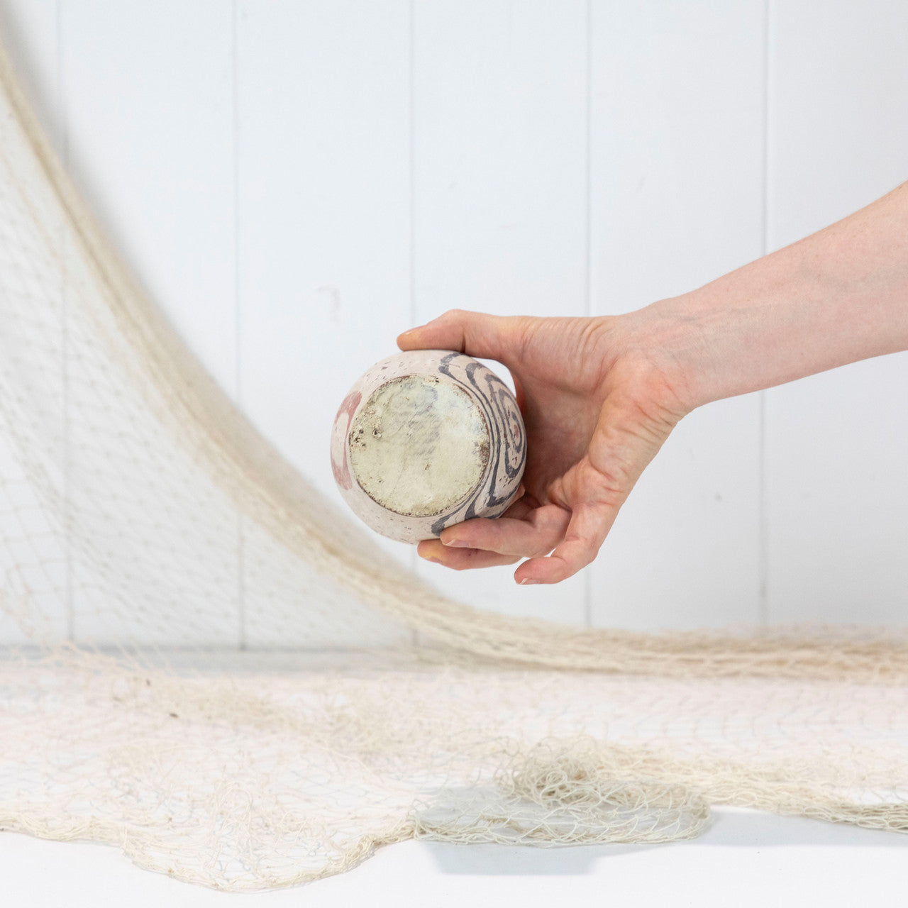 • This new terracotta pot has been hand painted with ochre and black on an off white base.