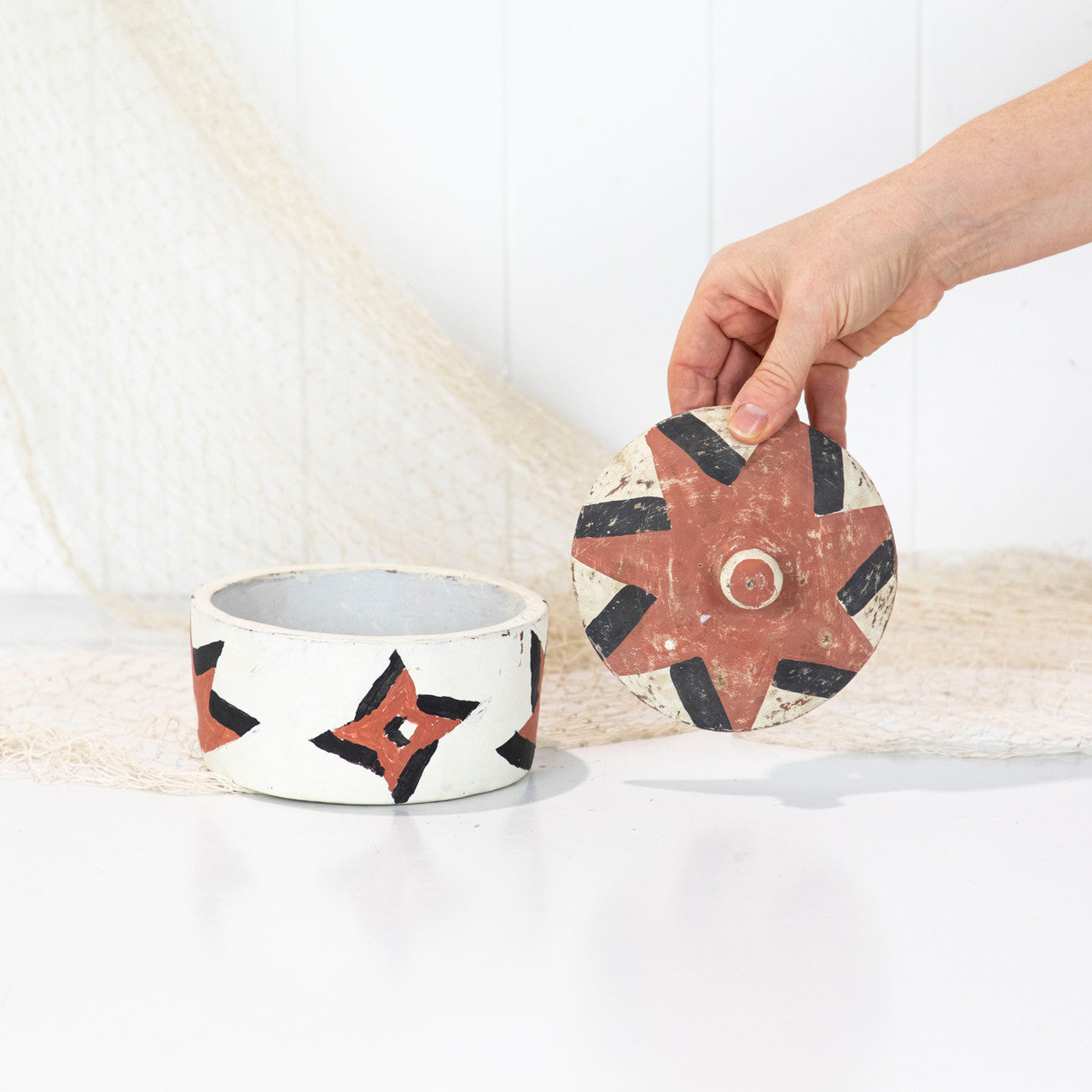 • This new terracotta pot with lid has been hand painted with ochre and black on an off white base.