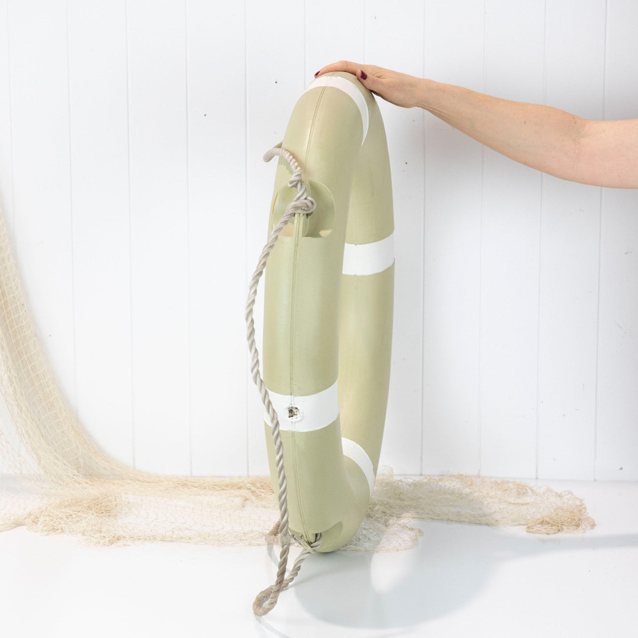 • We have painted this old rustic life ring Jolie Petit Chateau with white stripes, lightly sanded to a shabby finish and sealed with clear wax.