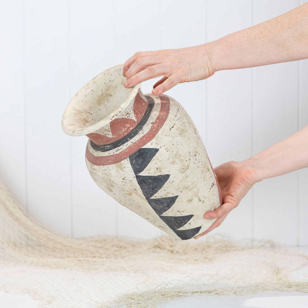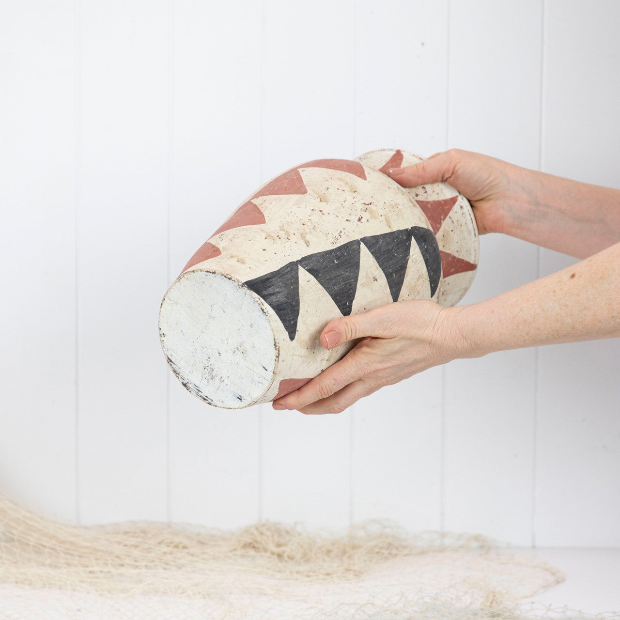 • This new terracotta pot has been hand painted with ochre and black on an off-white base.