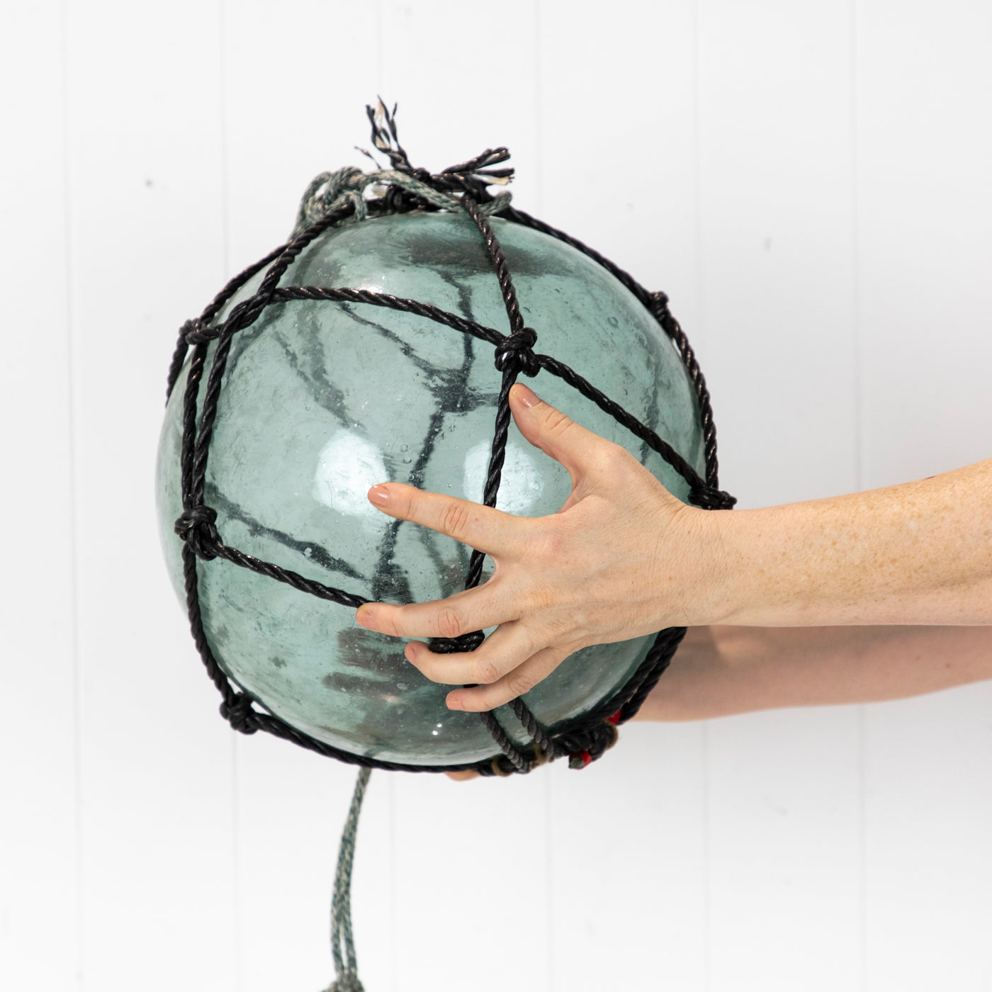 • This beautiful old 12" glass float has black net.