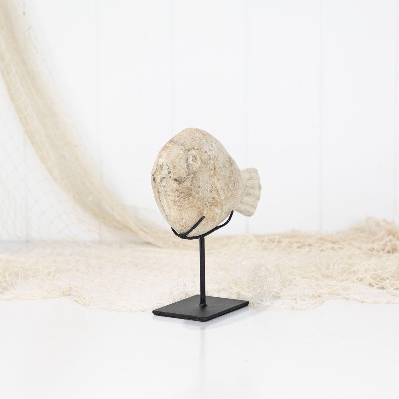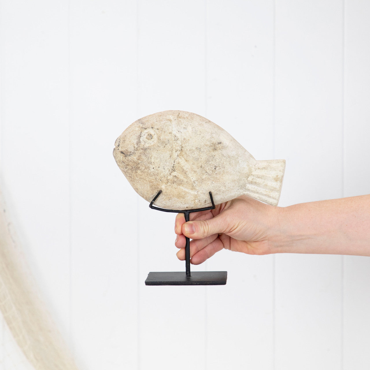 • This sculpture of a fish has been carved from a milky coloured stone that has speckles of brown and grey throughout.