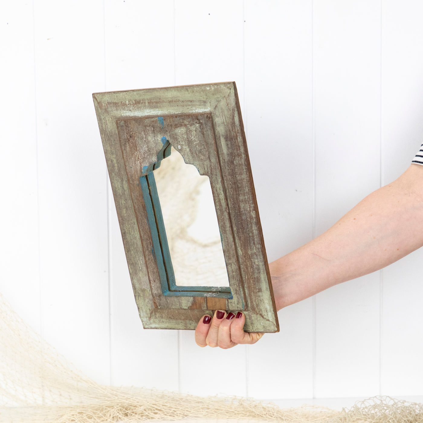 The timber is beautifully aged, with some remnants of past paint colours. Fitted with a hook ready to hang.