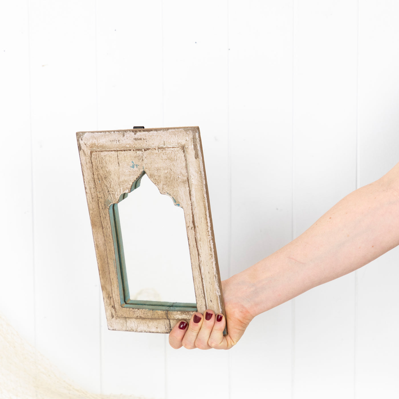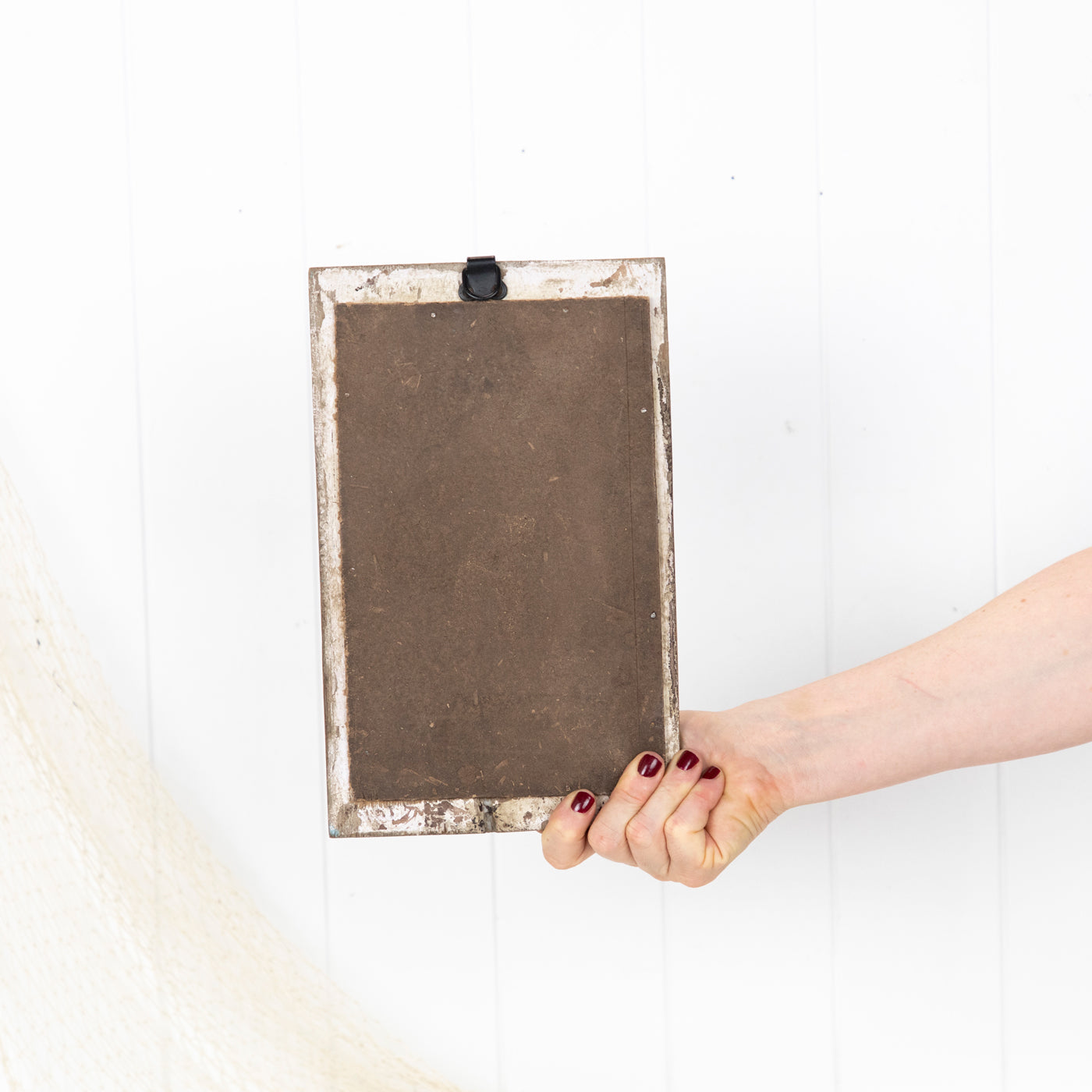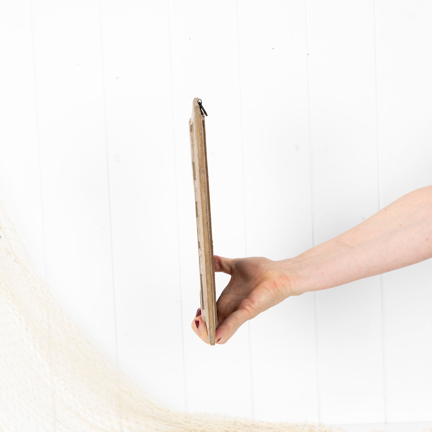 The timber is beautifully aged, with some remnants of past paint colours. Fitted with a hook ready to hang.