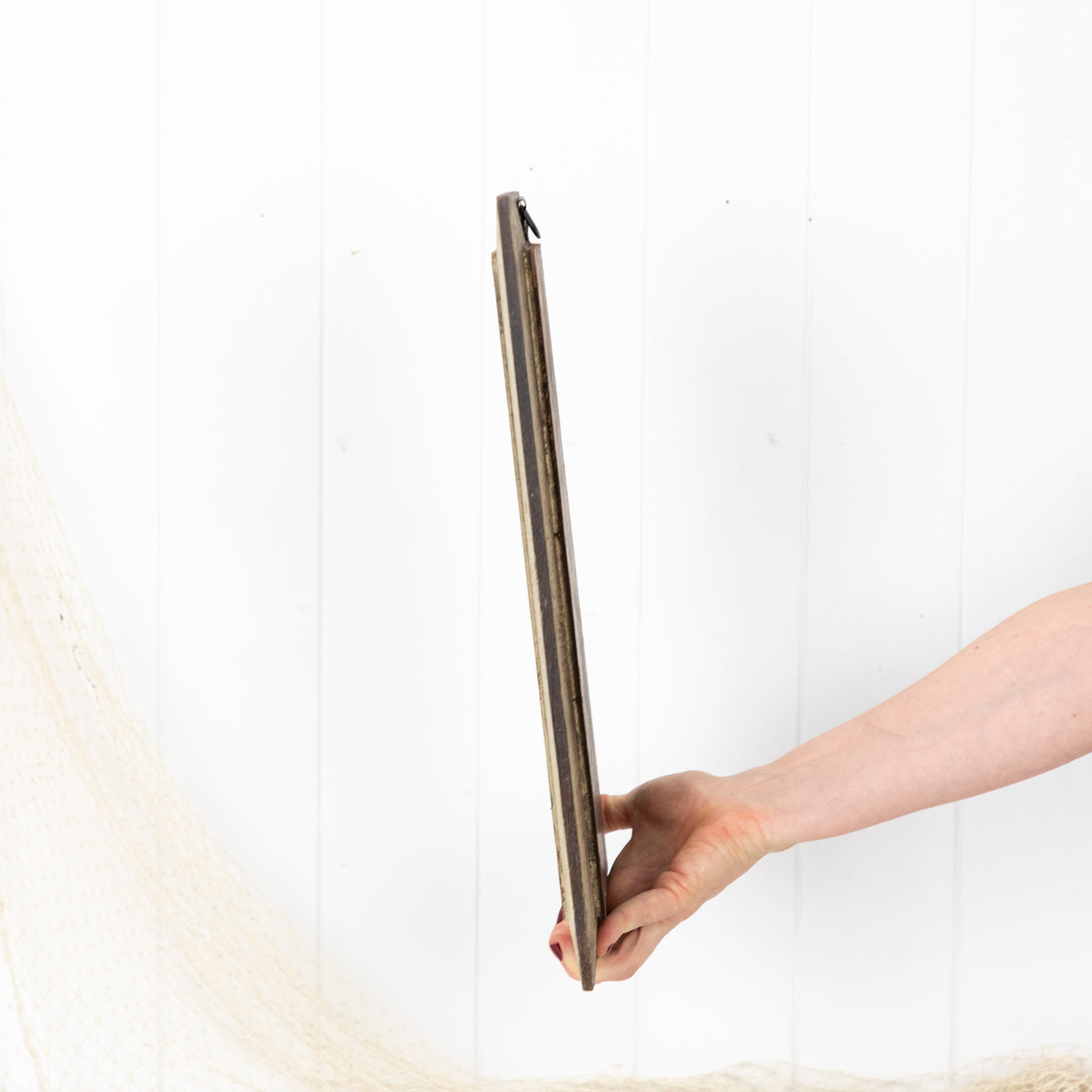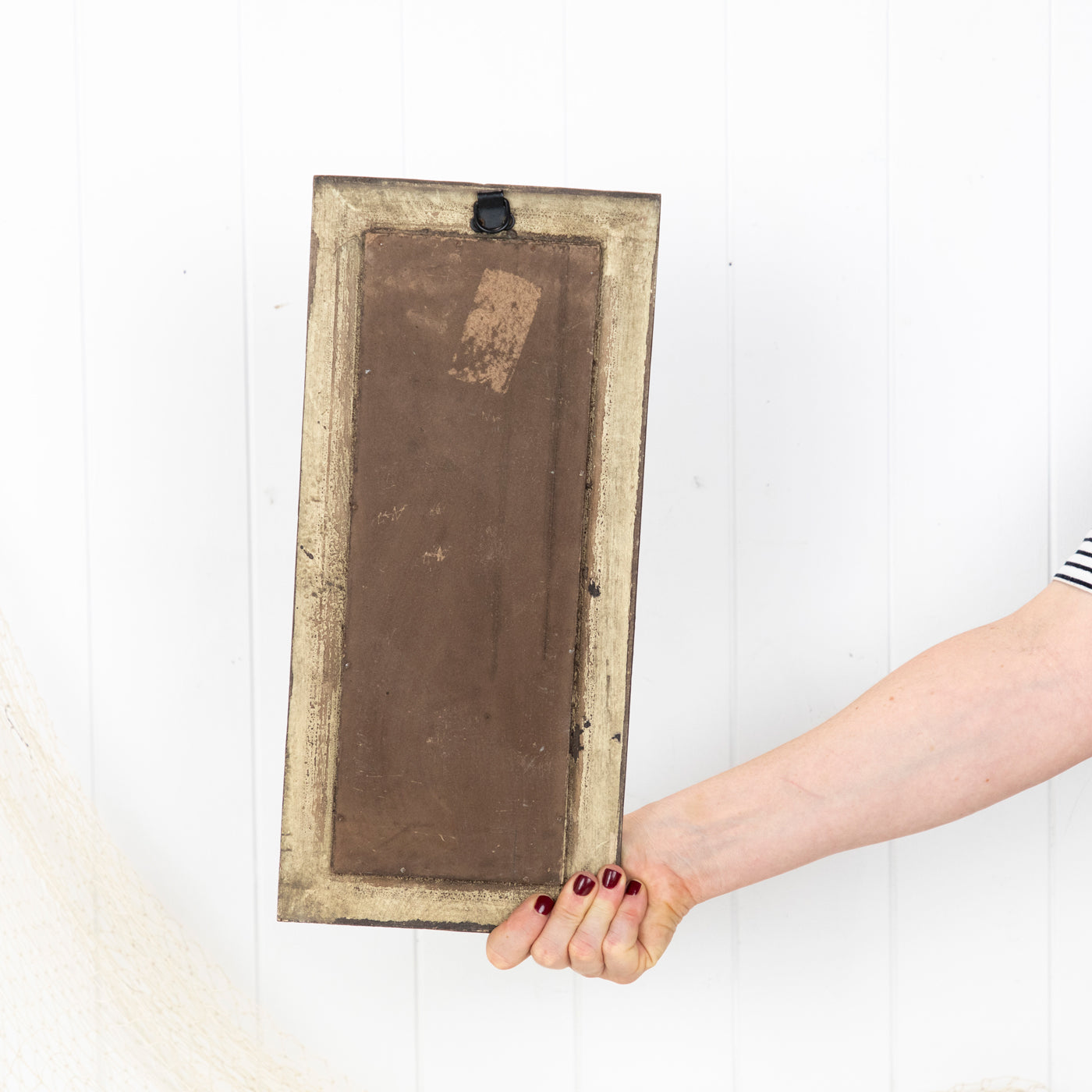 The timber is beautifully aged, with some remnants of past paint colours. Fitted with a hook ready to hang.