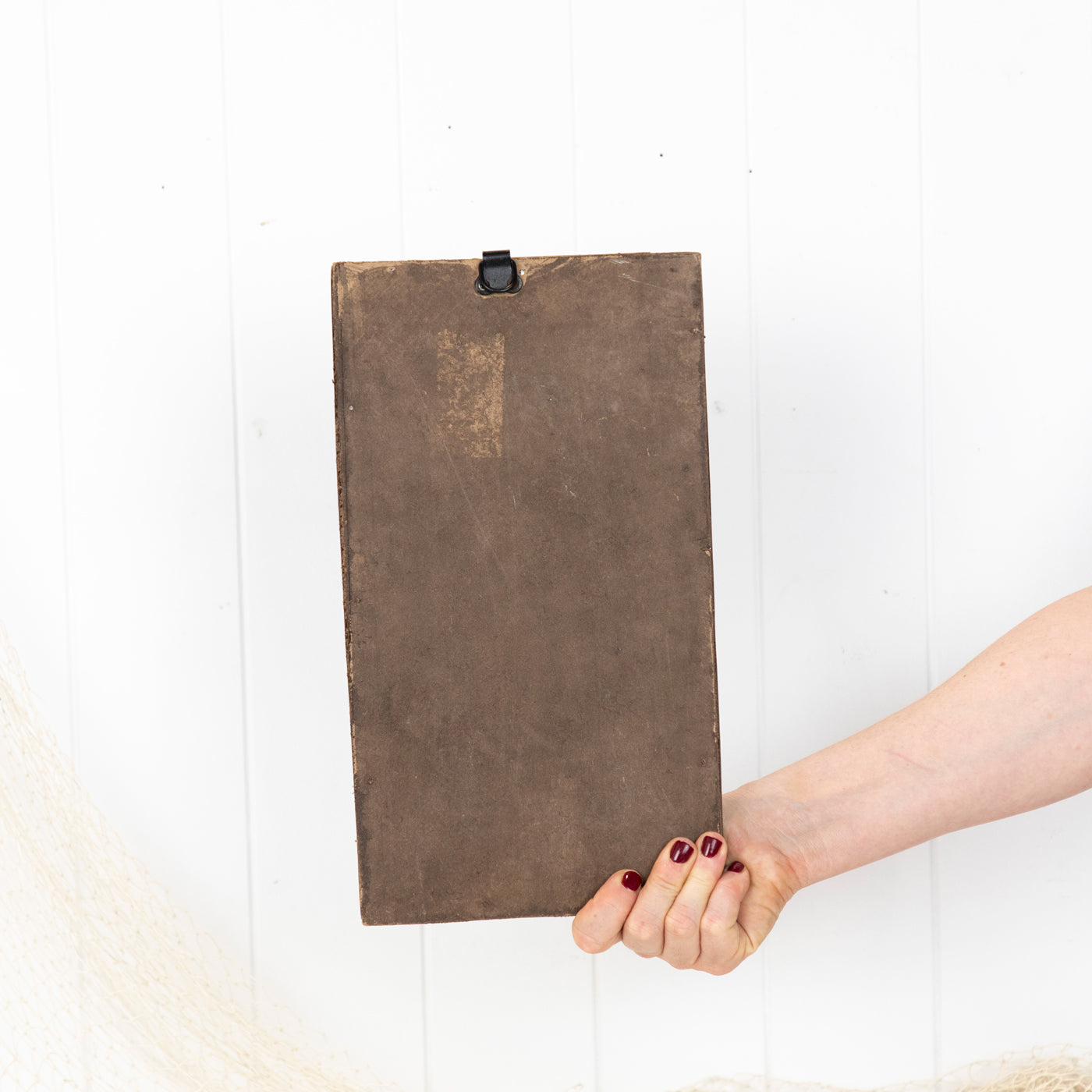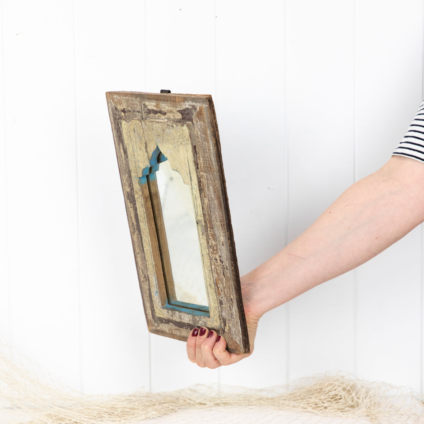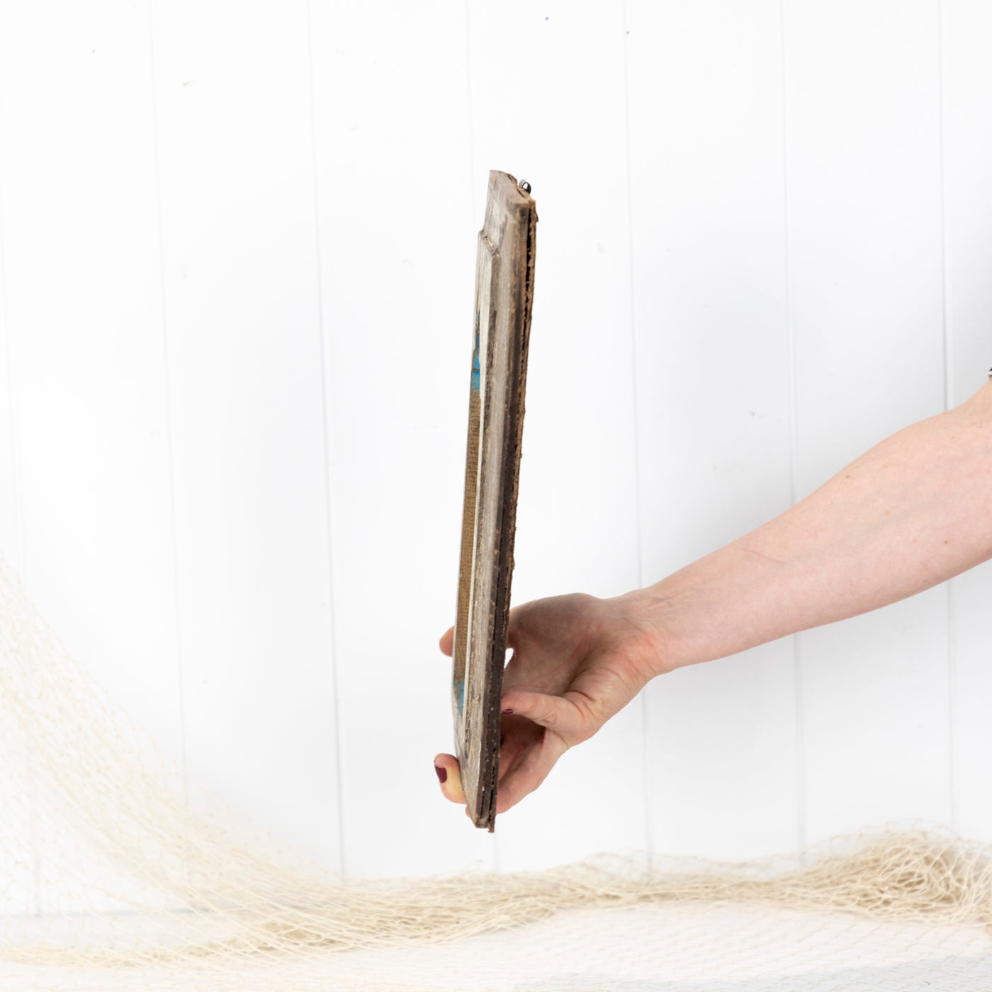 The timber is beautifully aged, with some remnants of past paint colours. Fitted with a hook ready to hang.
