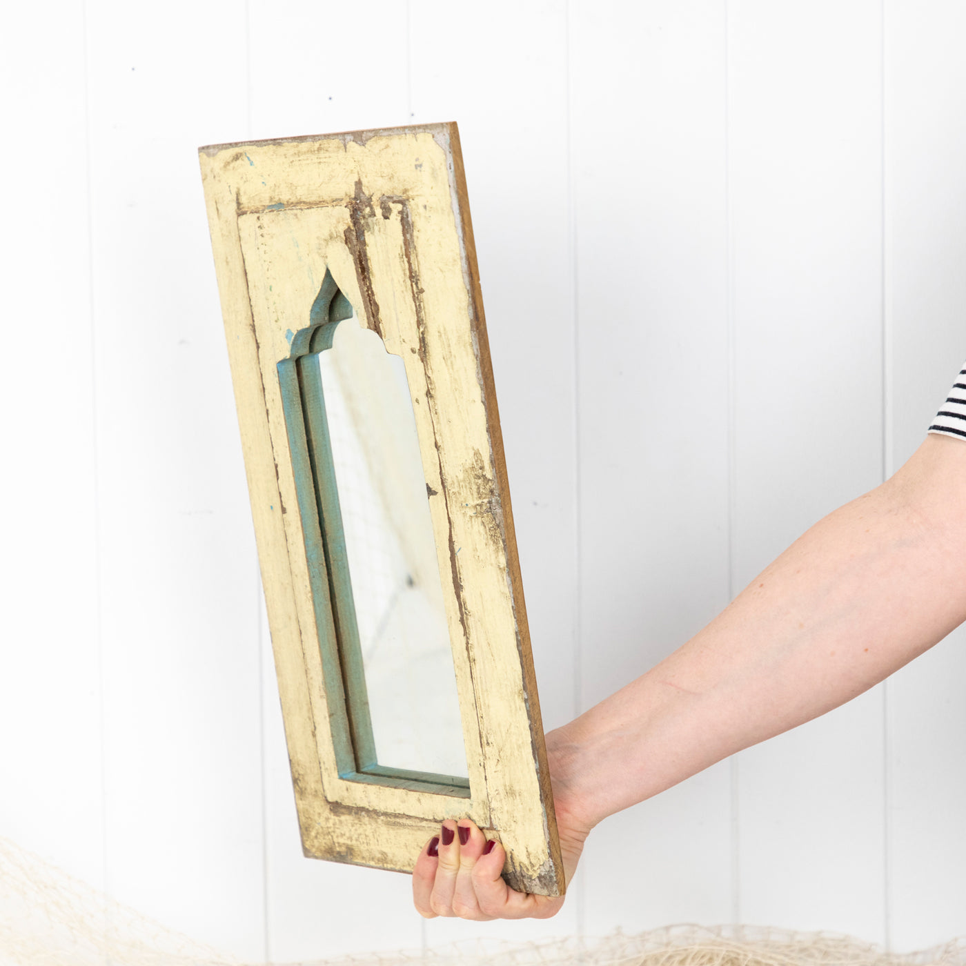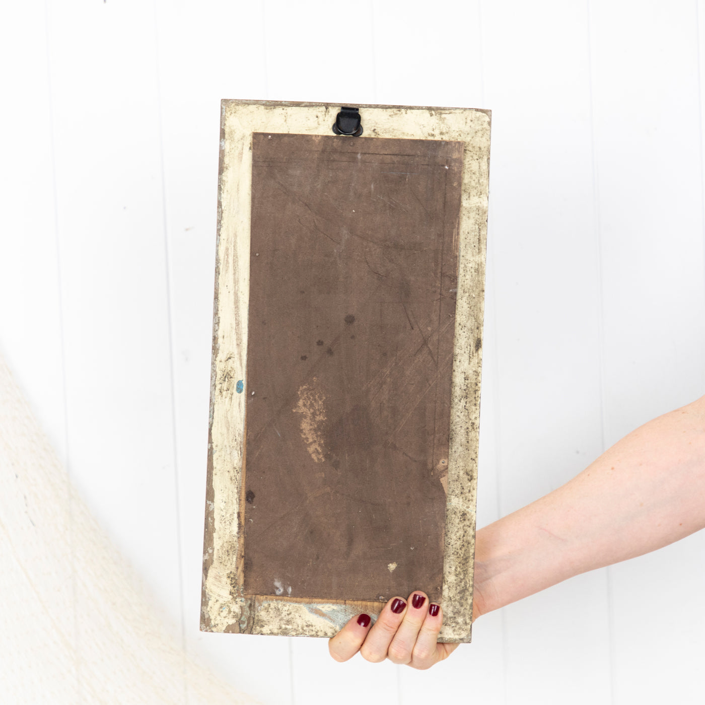 The timber is beautifully aged, with some remnants of past paint colours. Fitted with a hook ready to hang.