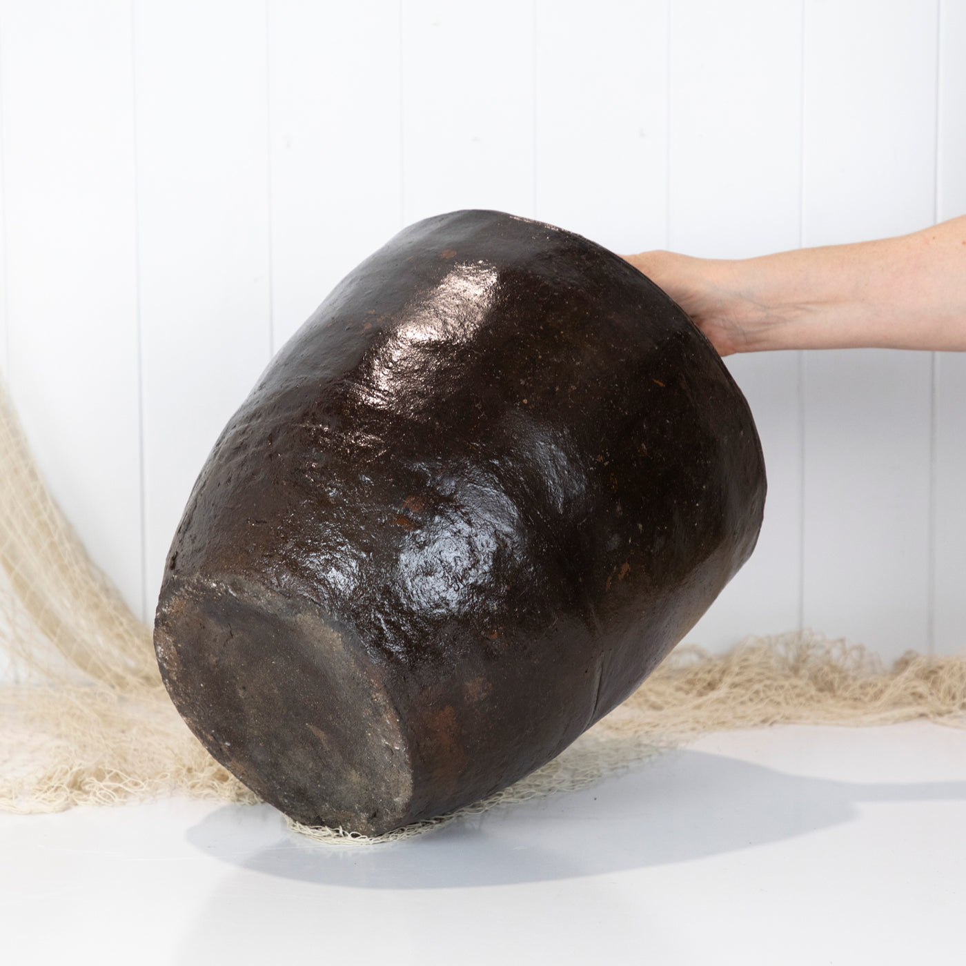 Used to carry goods for trade, it has a glossy dark brown glaze and irregular, handcrafted shape.